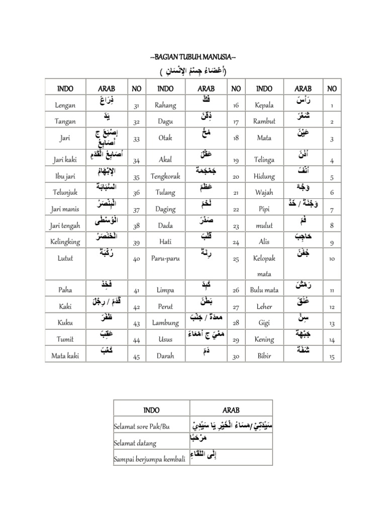 Bulu ketek bulu dada dan kemaluan bulu kemaluan jumlahnya 52 kalau masih anak kecil kemaluan jumlahnya 46. Badan kita mempuyai dua sisi yaitu sisi bagian dalam dan sisi bagian luar. Kamus indonesia arab tips pencarian gunakan kata dasar. Kosakata bahasa arab anggota tubuh assalamualaikum sahabat pecinta bahasa arab kali ini admin akan membagikan kosakata bahasa arab anggota tubuh lengkap.