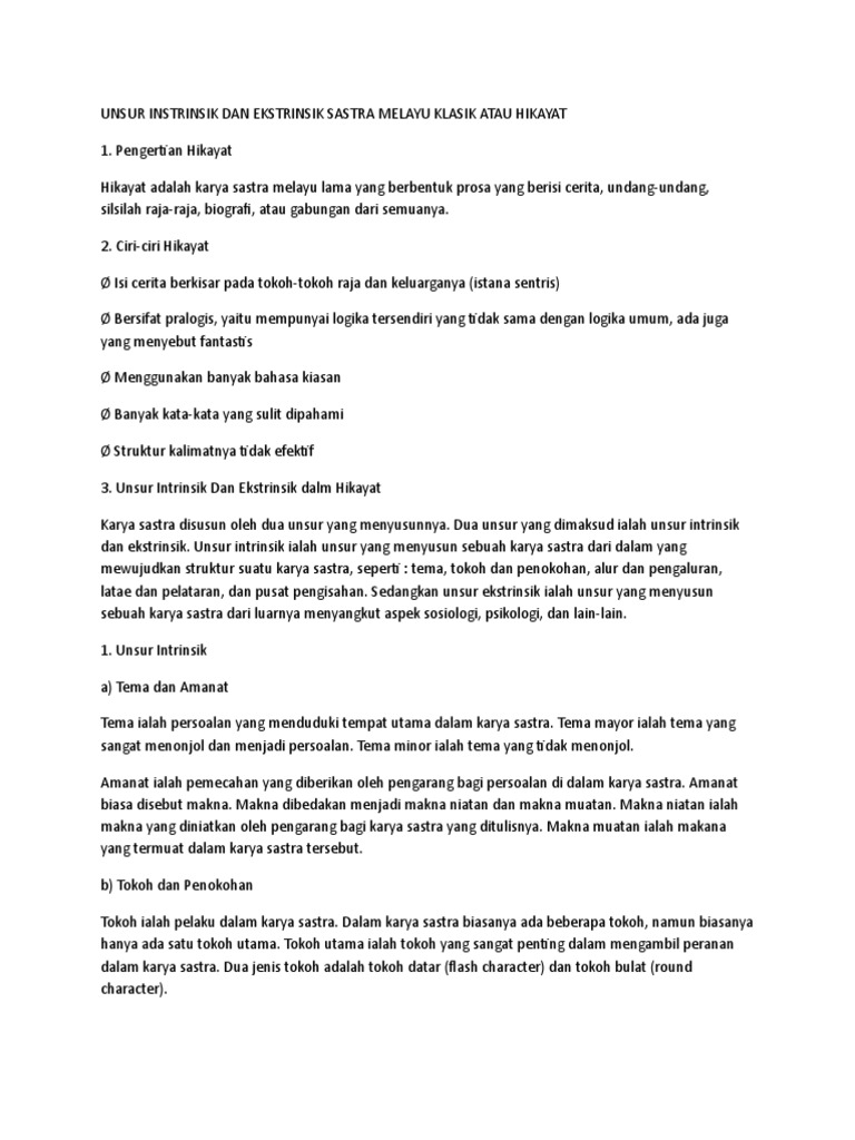 Contoh Hikayat Sastra Melayu Klasik Beserta Unsur Intrinsik Dan